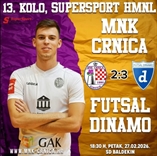 U sklopu 13. kola SuperSport HMNL, MNK Crnica u petak, 27. veljače 2026. godine, s početkom u 18:30 sati u Sportskoj dvorani Baldekin dočekuje MNK Futsal Dinamo.Pred šibenskom publikom očekuje se uzbudljiv i sadržajan susret protiv jedne od najkvalitetnijih momčadi lige, a Crnica će tražiti važne bodove u borbi za što bolji plasman na ljestvici.Uoči susreta utakmicu je najavio igrač Crnice Bruno Žilić:„Znamo da nam u petak u goste dolazi jedna od najboljih momčadi lige, ali i...