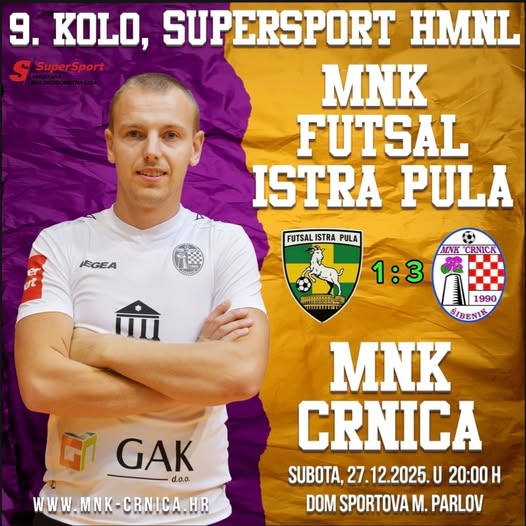 MNK Crnica upisala je vrijednu gostujuću pobjedu u 9. kolu SuperSport HMNL-a, svladavši domaćina u Domu sportova Mate Parlov u Puli rezultatom 1:3, u susretu od iznimne važnosti za konačni poredak na kraju prvog dijela prvenstva.